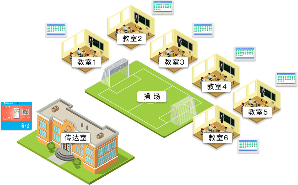 多媒体签到机自带LED显示屏,可播放学校的通知或海报。通过配套的无线额温枪还可以实现晨午检等功能。