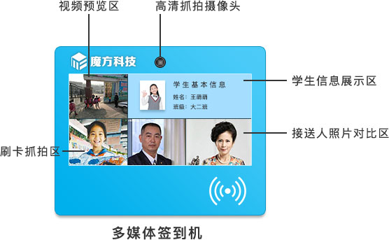 多媒体签到机带有刷卡拍照和人照对比功能。接送人刷卡时,设备屏幕上会显示系统后台登记的接送人照片和刷卡抓拍的照片,